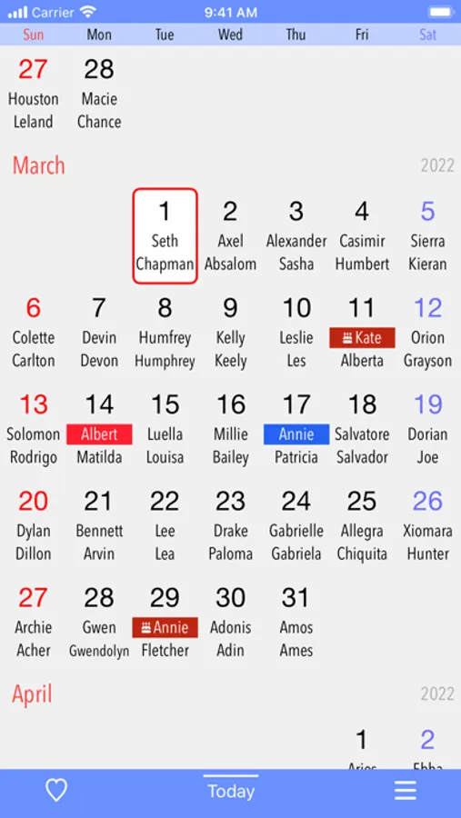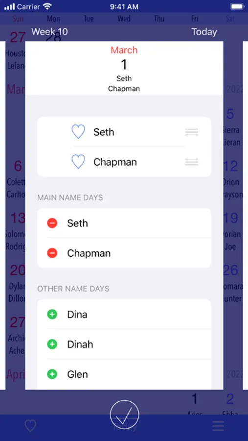 ・Editable visualization of the day by reordering your favorites, main and other name days of the current country