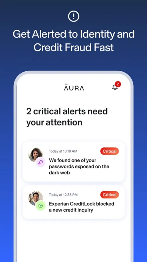 Our award-winning technology¹ monitors and alerts you if your personal information, passwords, credit, and financial accounts are at risk. When it comes to fraud protection, every second counts. Aura alerts you to credit fraud up to 250x faster than the competition. Aura’s proactive protection helps stop threats before they strike.