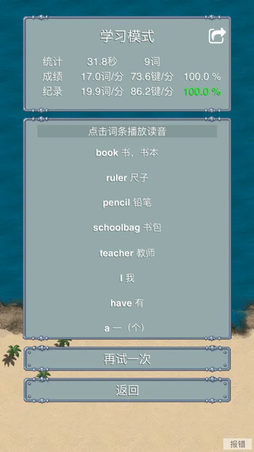 * 练习素材包含中小学英语教材同步词表,大学英语四六级词表。