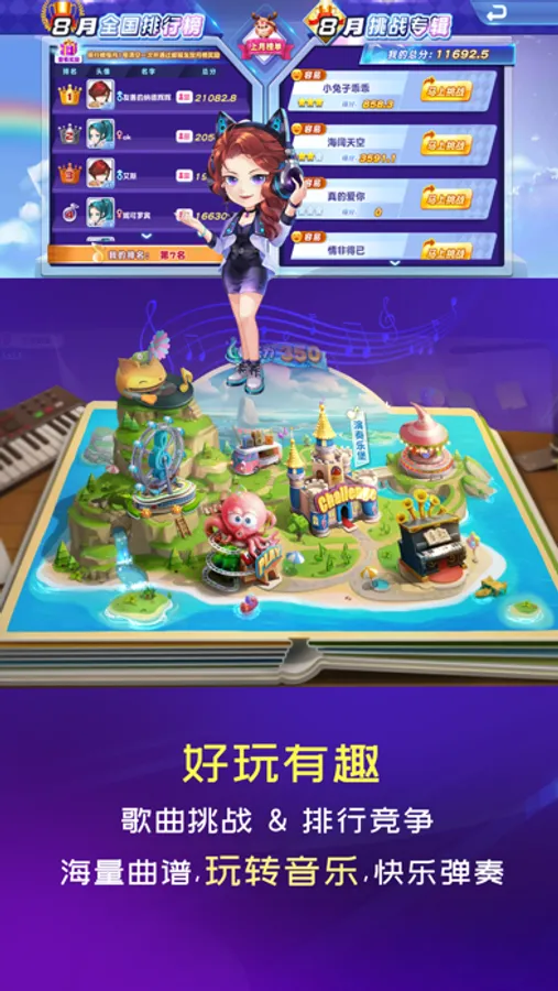 有趣多样的弹琴音乐竞赛模式,可以通过乐堡对决与朋友一较高下,斗琴赛场实时多人弹奏大比拼,音乐答人比比谁是最强大脑!