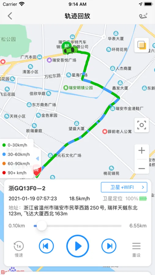 2.轨迹查询,可以按日期,时间段查询行程轨迹以及回放轨迹;