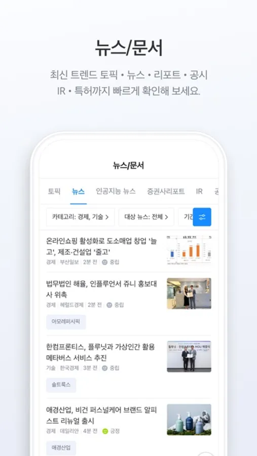 트렌드 토픽, 뉴스, 리포트, IR, 공시, 특허 정보까지 누구보다 발 빠르게 다양한 문서 정보도 확인할 수 있어요.