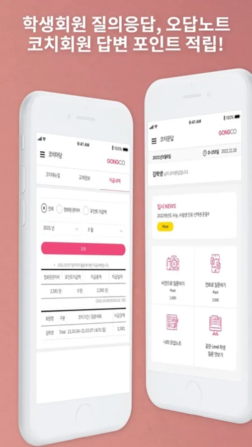 - 공부 중 사진 또는 전화 질문을 등록하고 코치들은 답변을 등록하여 질문 해결