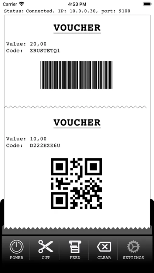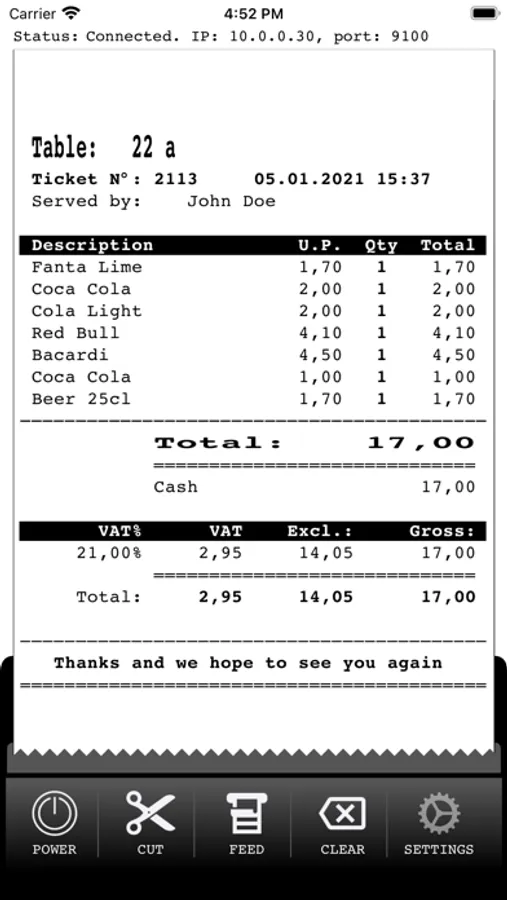 Print receipts from POS applications that support ESC/POS printing over IP. Just power on the printer and configure the IP-address and port displayed in your POS application.