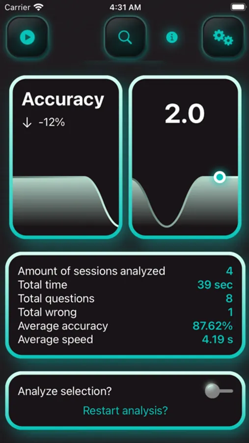 CountQuick! is a tool to help you practice solving math problems mentally and track your results! You get full control over your sessions: select your numerical range, how long you want to play and what kind of problems you want to focus on today! Not only can you choose to solve addition, subtraction and multiplication problems but also fractions and division - but don't forget to simplify those fractions!