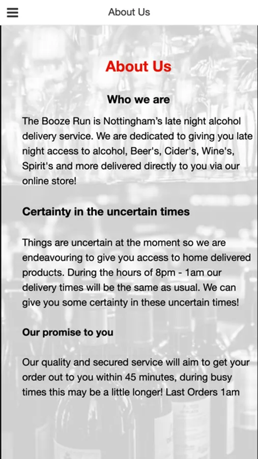 If you are in Nottingham and are looking for Alcohol Home Delivery near me, look no further The Booze Run is a one-stop solution for all kinds of Alcohol Delivery in Nottingham. Our online 24 Hour Alcohol Delivery in Nottingham delivers a variety of alcoholic beverages including Beer, Spirits, Cider, Wine, Champagne, Mixers, Alcopops, and Cigarettes.