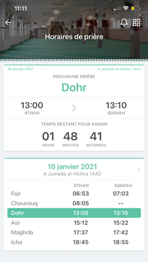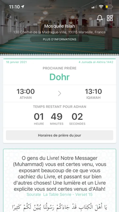 - Horaires de prières réels de la mosquée