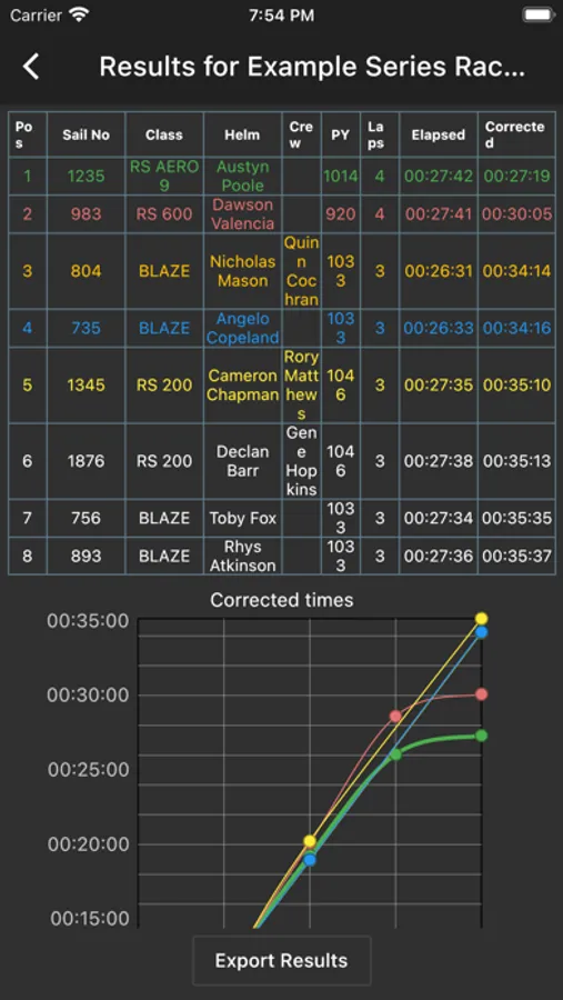 The app also offers, via the cloud, immediate result sharing with competitors, and graphing of results.
