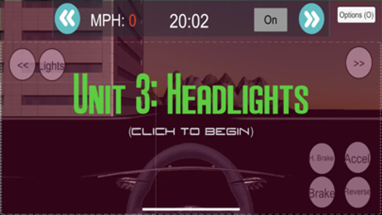 Intended for beginner drivers. Helps introduce some basic driving concepts to practice for the DMV written/practical exam. Learn the basics of driving in this virtual world before setting out onto the road. Contains 4 units including making turns, parking policies, headlight etiquette, and miscellaneous scenarios.