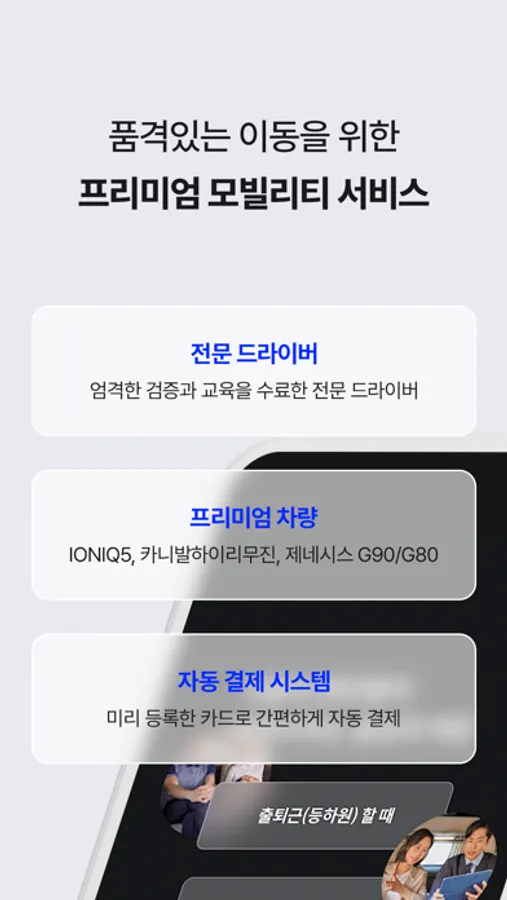 고객의 라이프스타일과 취향에 맞는 프리미엄 차량과 운전서비스를 지원하여, 편하고 쾌적하게 이동할 수 있도록 고품격 서비스를 제공합니다.