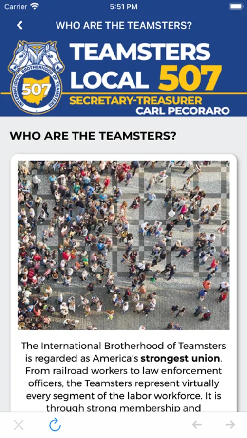 Teamsters Local 507 mobile app is designed specifically for our members to keep them informed and engaged in their Union. The app provides up to date notifications, general news and content, contact information, specific contract updates, and more!