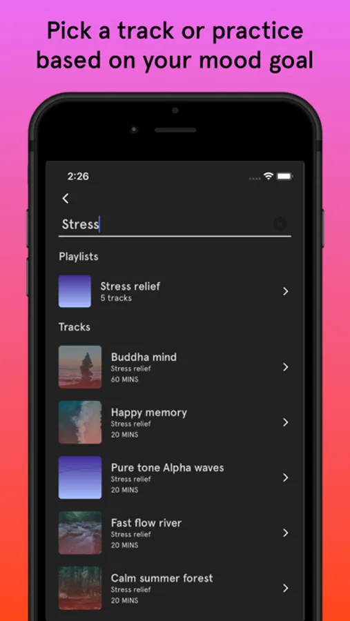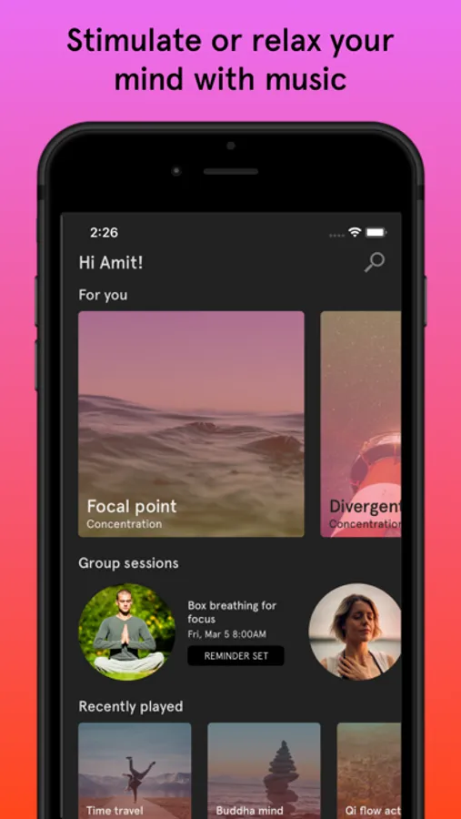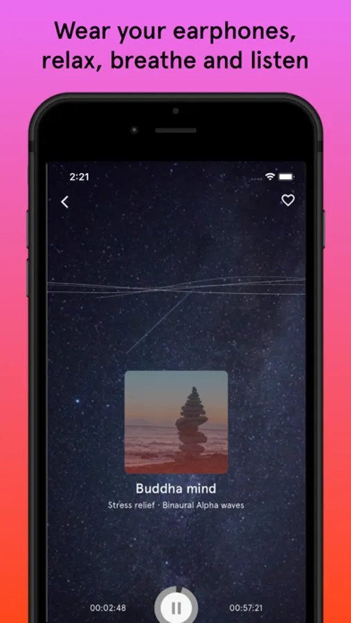 Choose from a collection of very high-quality musical tracks based on your mood goal, from stress and anxiety relief to focus, concentration, and critical thinking. Get into a comfortable (preferably, seated) position, wear your earphones, relax, breathe and listen to the sounds playing in your ears.