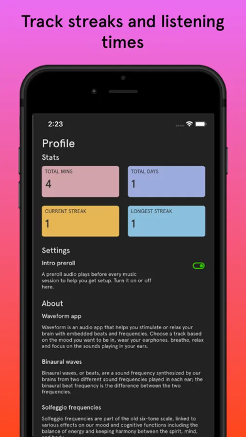 Each Waveform track is embedded with one or more binaural beats, solfeggio frequencies, or Schumann resonance based on the mood the track is composed for.
