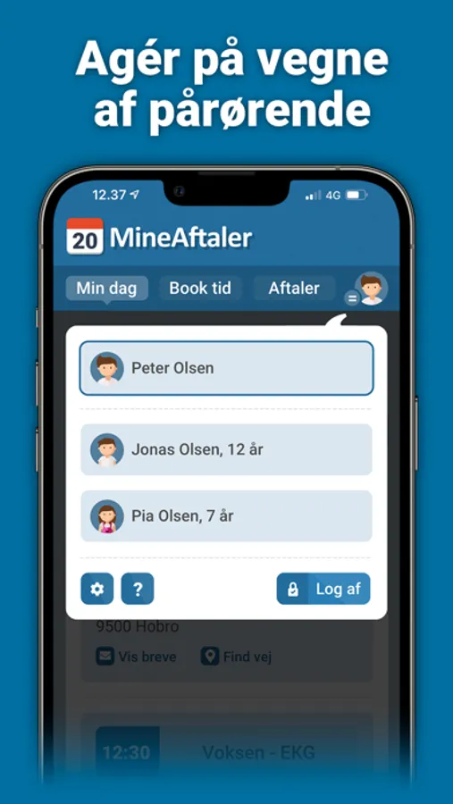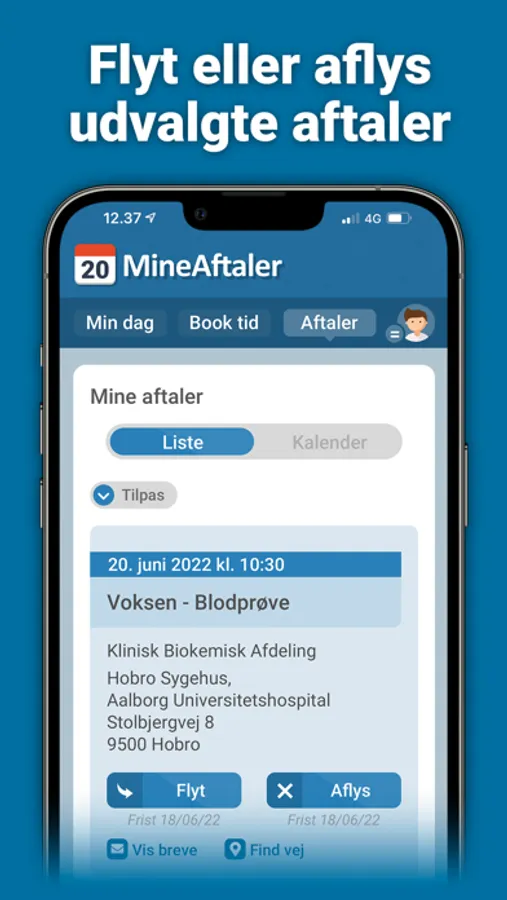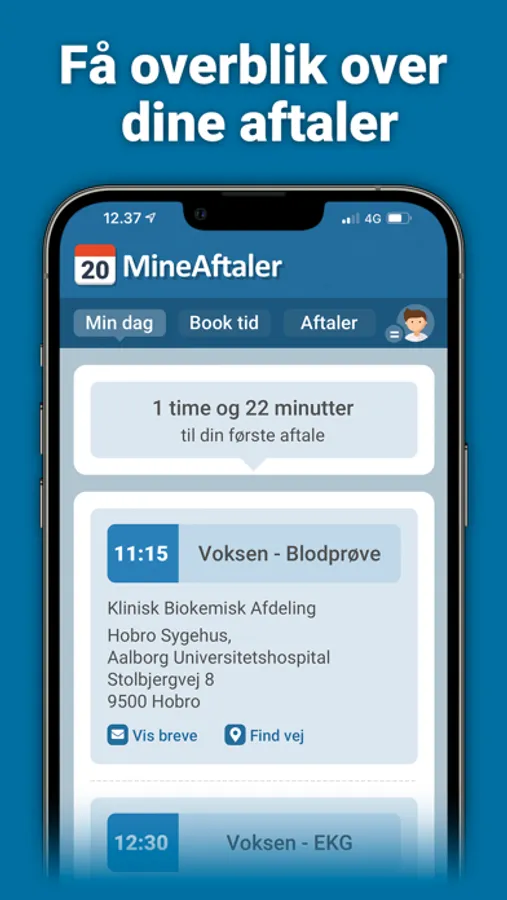 Med "MineAftaler" kan du se alle dine kommende og tidligere aftaler med hospitalerne i Region Nordjylland. Visse typer af aftaler kan du selv booke, aflyse eller ændre i appen. På dagen for din aftale kan du også følge med i, hvor lang tid der er til, at det bliver din tur – og få notifikationer direkte på din telefon, når der fx er 5 min. til, at du bliver kaldt ind. Du kan også booke aftaler for dine pårørende via appen.