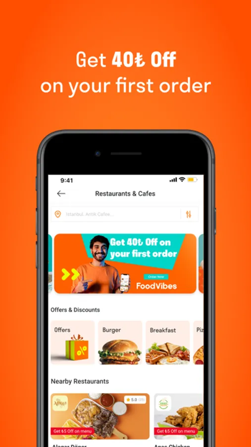 Are you looking for a food delivery app in Istanbul? Now, many restaurants are closer to you! Foodvibes provides delivery from many restaurants, whether you want a burger or a pizza. Oriental or Western food, chicken, or even sweets! All your options are available. Also, you can choose between special Foodvibes’ delivery, restaurant’s delivery, or pick up service, depending on your needs.