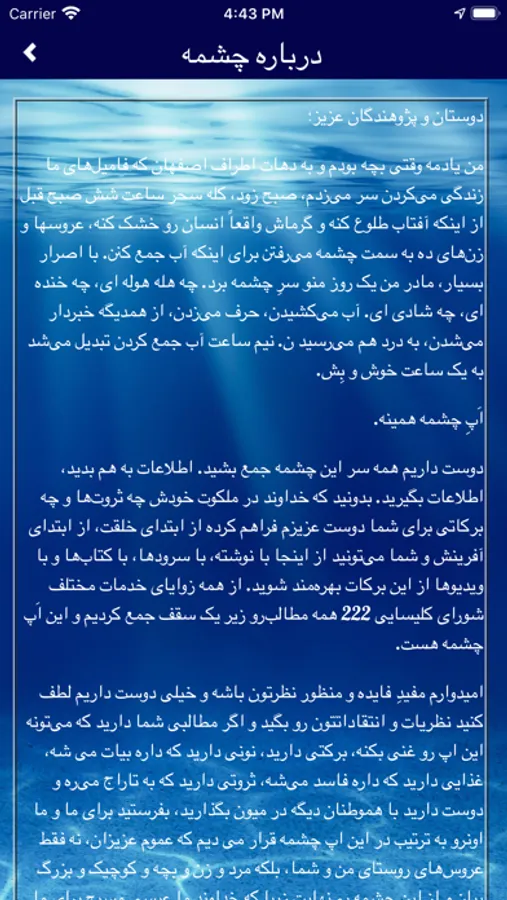 دوست داریم همه سر این چشمه جمع بشید. اطلاعات به هم بدید، اطلاعات بگیرید. بدونید که خداوند در ملکوت خودش چه ثروتها و چه برکاتی برای شما دوست عزیزم فراهم کرده، از ابتدای خلقت، از ابتدای آفرینش و شما میتونید از اینجا با نوشته، با سرودها، با کتاب ها و با ویدیوها از این برکات بهره مند شوید. از همه زوایای خدمات مختلف شورای کلیسایی 222 همه مطالب رو زیر یک سقف جمع کردیم و این اَپلیکیشن چشمه هست.