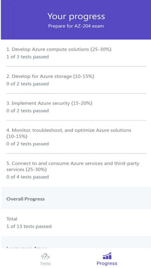 App contains 13 unique tests which cover all topics from the AZ-204 Microsoft Certification test.