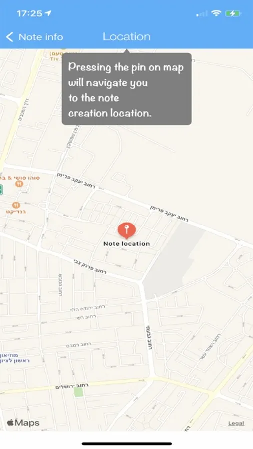 11. app support showing note creation location (also navigate to that location view apple maps or Waze app).