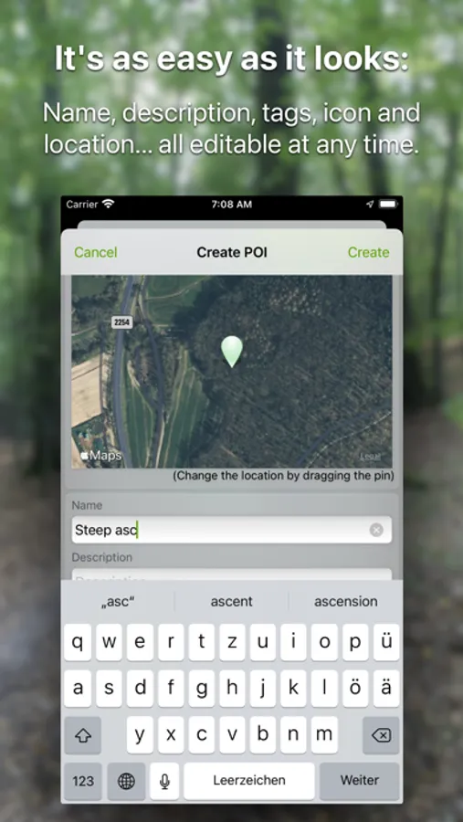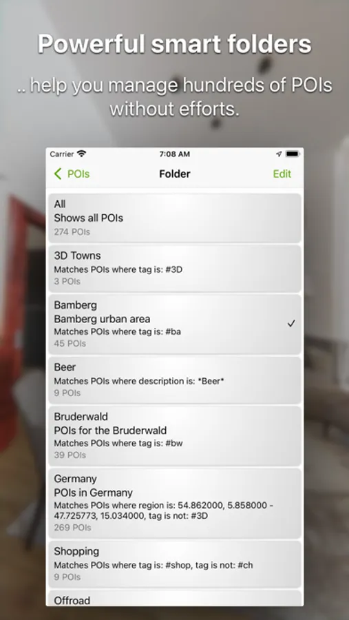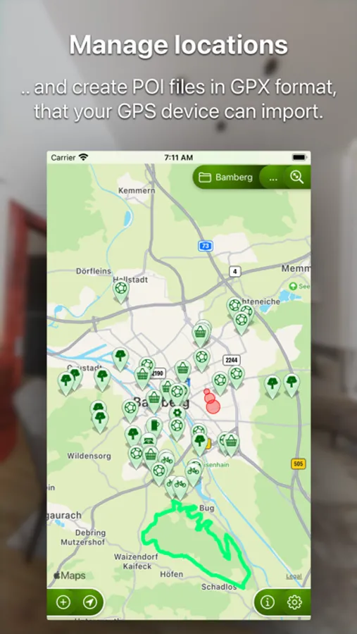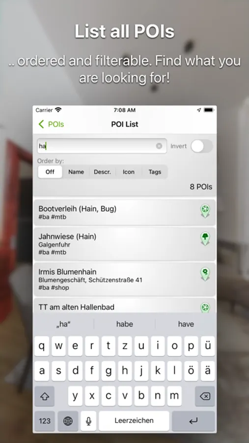Get located and create each POI individually or import an existing POI file (in GPX or KML format). You can also extract single points of a GPX tracking as POIs. Change names and descriptions of your POIs and assign tags.