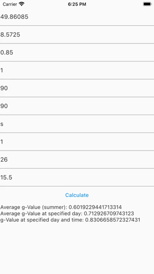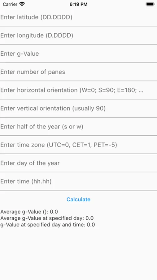 The app Angular g-value Calculator allows anyone interested in energy transmission through windows to calculate angular g-values. The user first enters required data such as his geo-coordinates, the number of glass panes, the g-value of the glass and the vertical and the horizontal orientation of the window. When the ‘Calculate’-button is tapped the app calculates the average g-value during the specified summer or winter half-year. If the user enters a specific day and time of the year as well, the average g-value for that day and the exact g-value at that time are calculated.