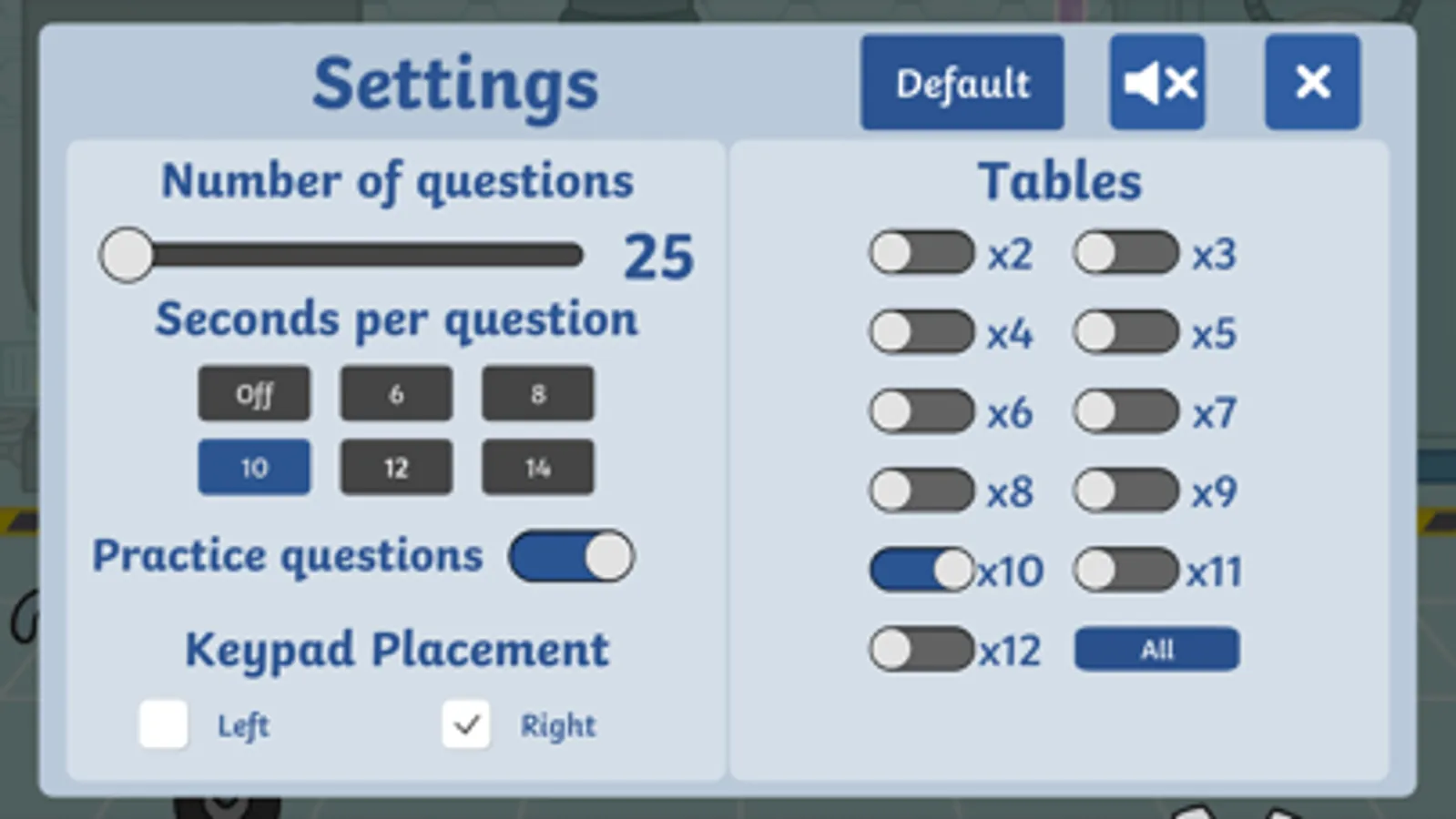 Alternatively, you can use the default setting which follows the exact format of the MTC - 25 questions with children given 6 seconds per question and 3 seconds in between.