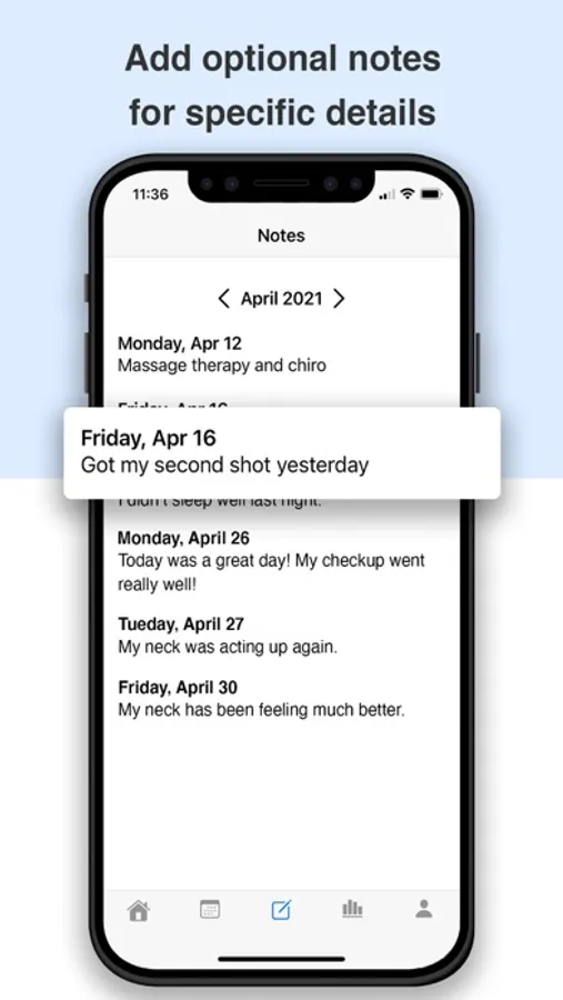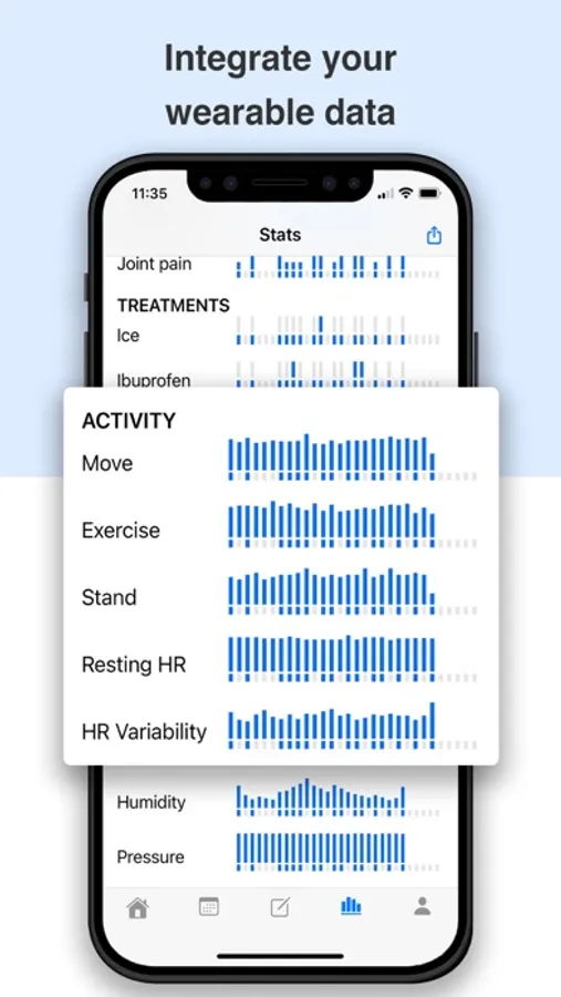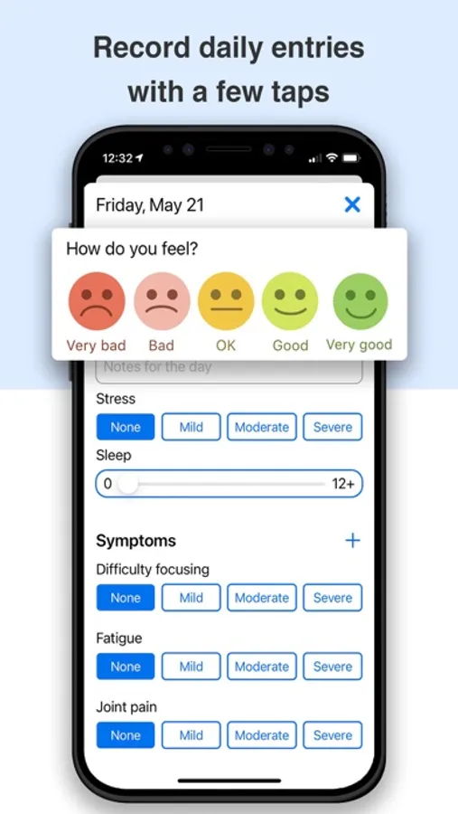 Easily enter your mood, stress, sleep, medications and symptoms into a day. Need more information about that day? Use the notes section to record your doctor's appointments, tests, or other details about how you were feeling that day. Journal My Health can also record weather data from OpenWeatherMap and health data from your Apple Watch and the Health app, or a Fitbit if you prefer, to give you a more complete picture of other factors which could affect your symptoms.