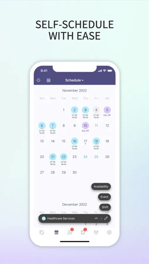 Input your shifts or work-related events (e.g., orientation). Or bid for your preferred shifts in the self-schedule window allowed by your facility.