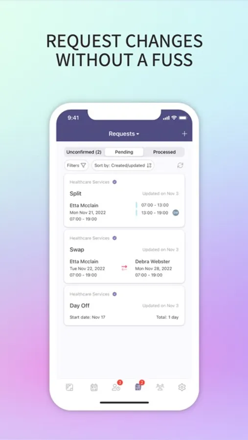 Request changes to your shifts, such as swapping with colleagues or taking days off. Check the status of submitted requests along with comments from the management.