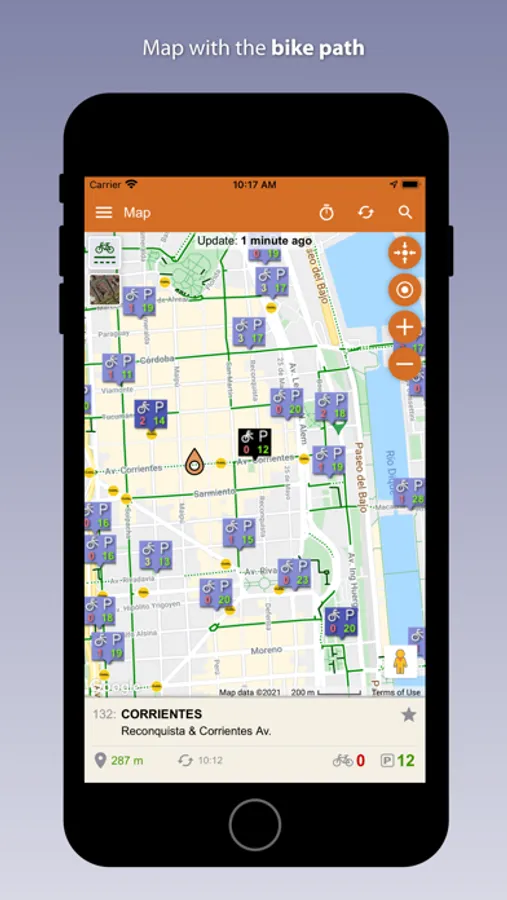 - Map of the city with the position of stations showing the number of bikes and the free stands for each station. It includes also the BIKE PATH.