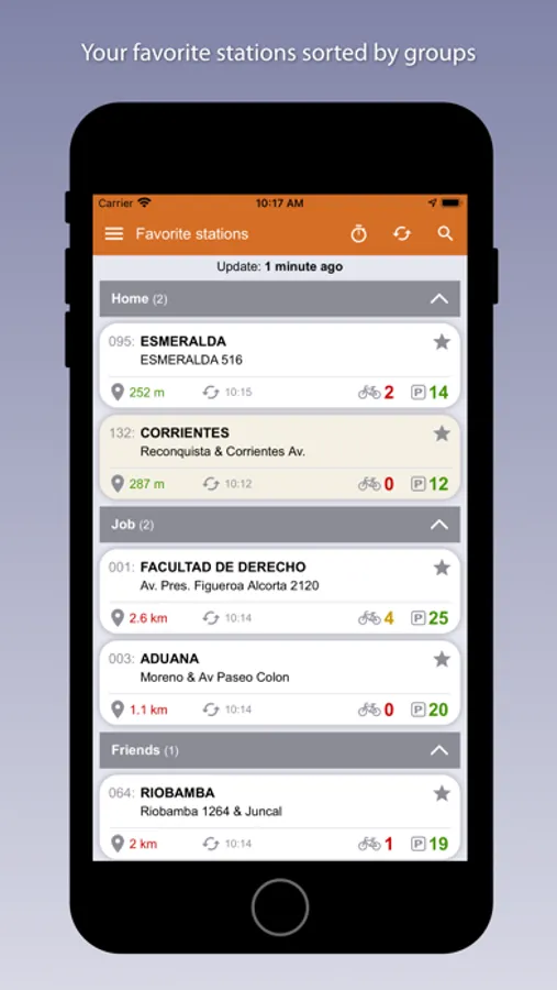 - List of favorite stations categorized by groups (home, work, friends or general).