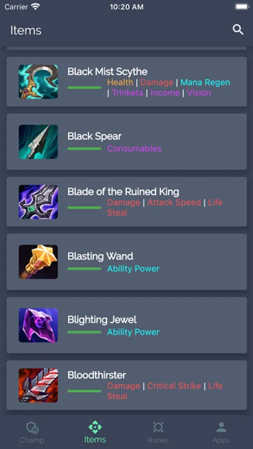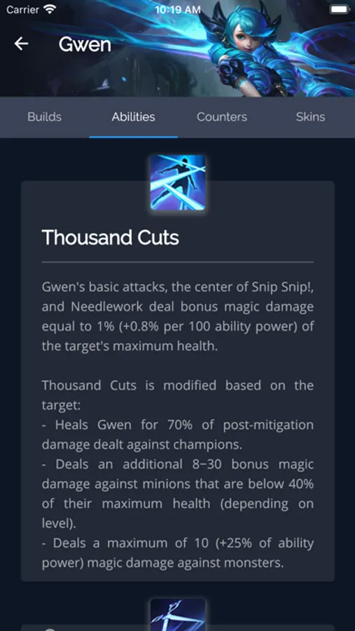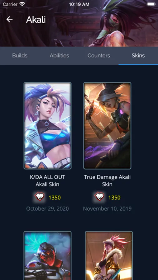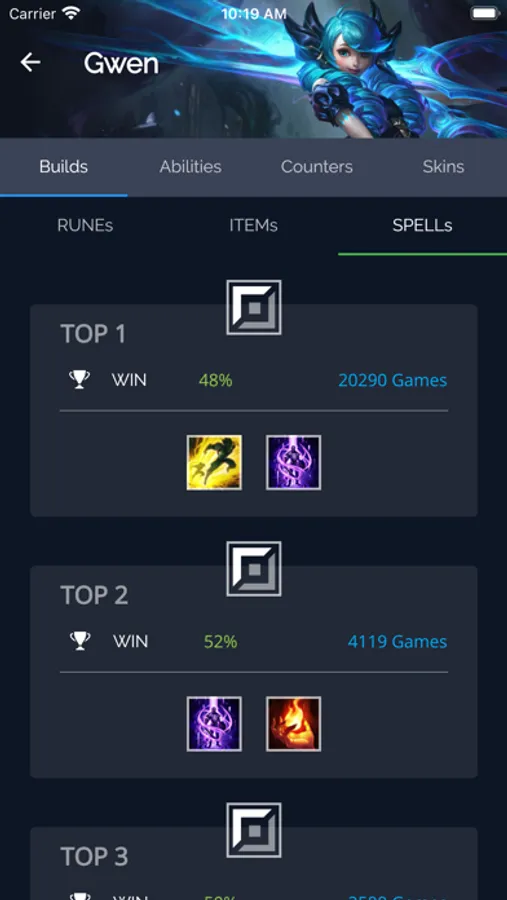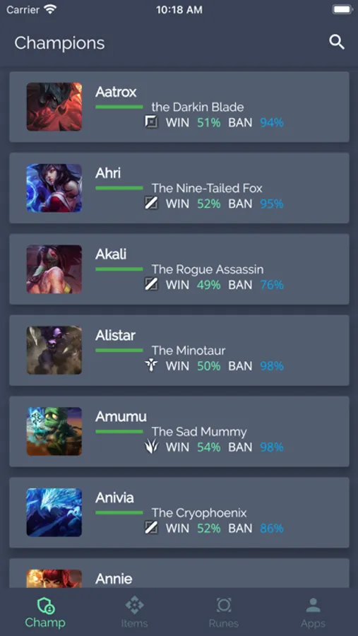 - Latest champions: detail of new champion, abilities, skills, spells, runes, items, counter champion, cooldown time, skill order, rate of win, rate of ban.