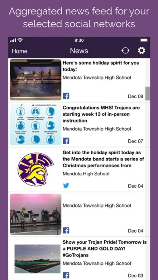 Stay informed of school announcements, activities and events from Mendota High School. Select your preferred list of social media accounts and monitor activity from several social networks, including Facebook, Twitter and Youtube. Transfer any activity or event directly to your iOS calendar with a single tap.