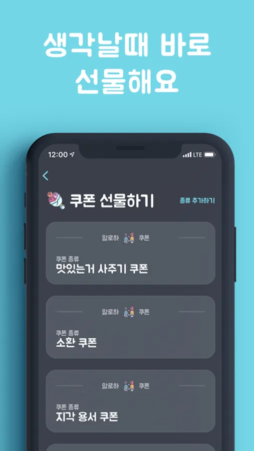 쿠폰북에 쿠폰의 이름과 내용을 한번만 추가해두면 필요한 순간에 손쉽게 선물할 수 있어요.