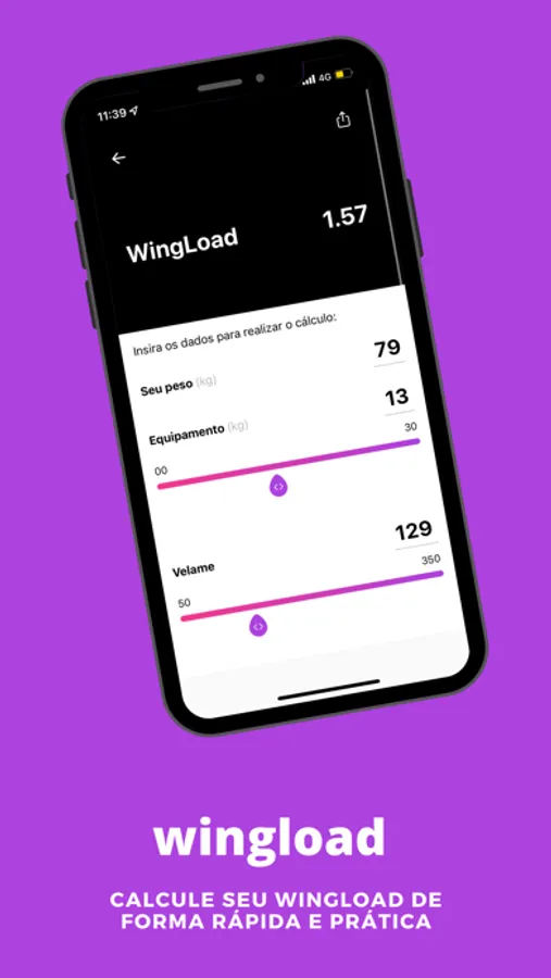 Aquela informação super importante que as vezes é chata pra lembrar o cálculo. A gente resolve bem rápido. Só colocar o peso, peso do equipo e tamanho do velame e o resto deixa com a gente!