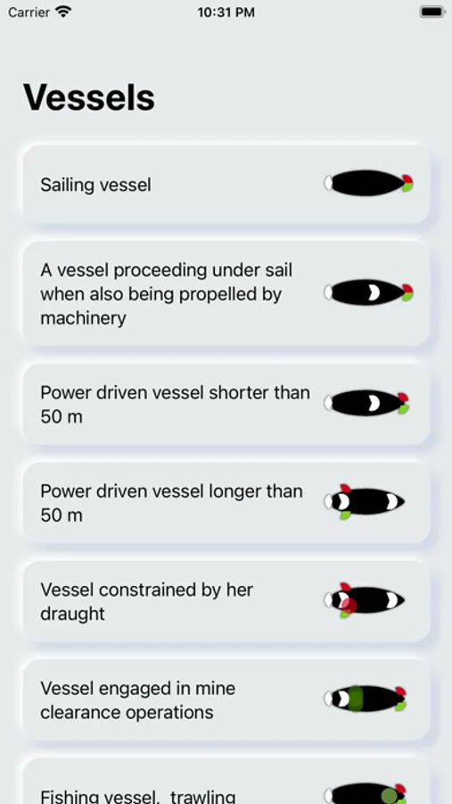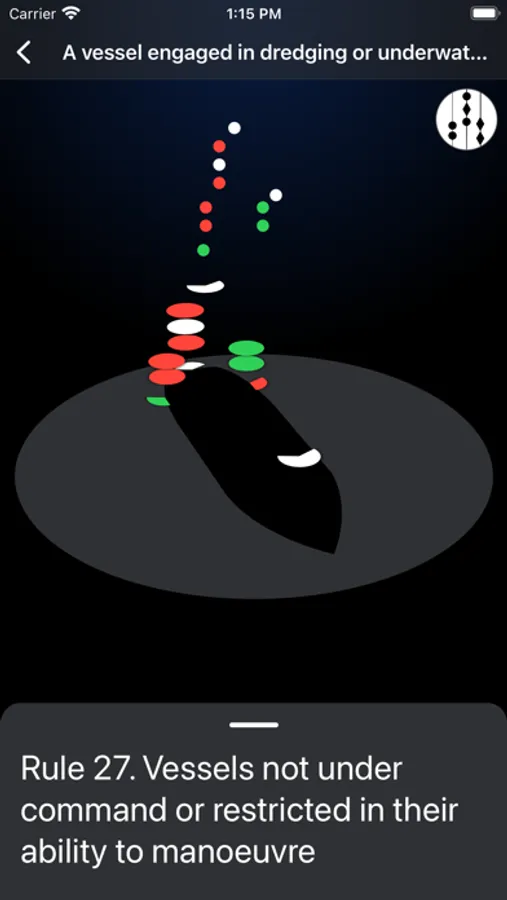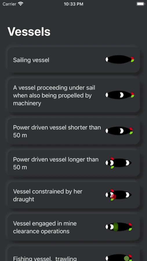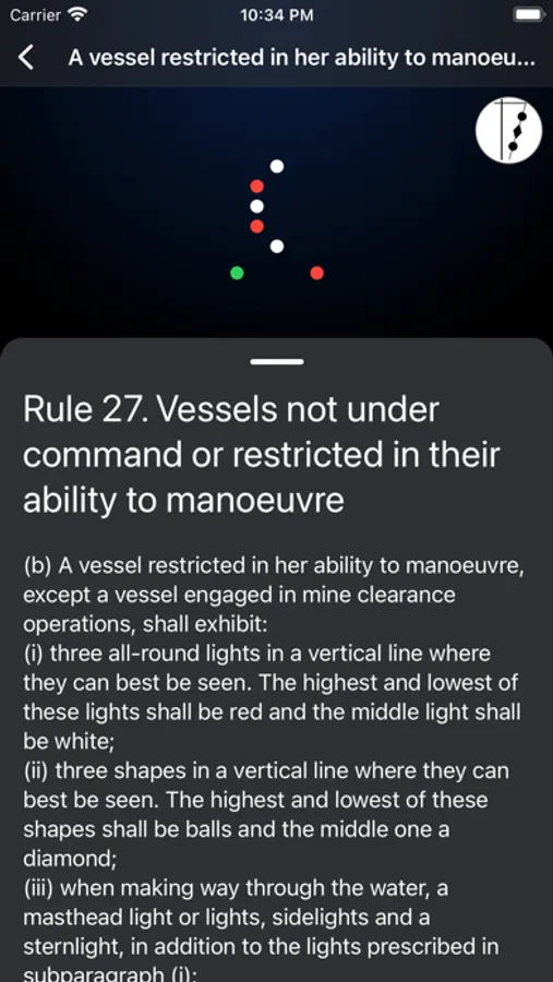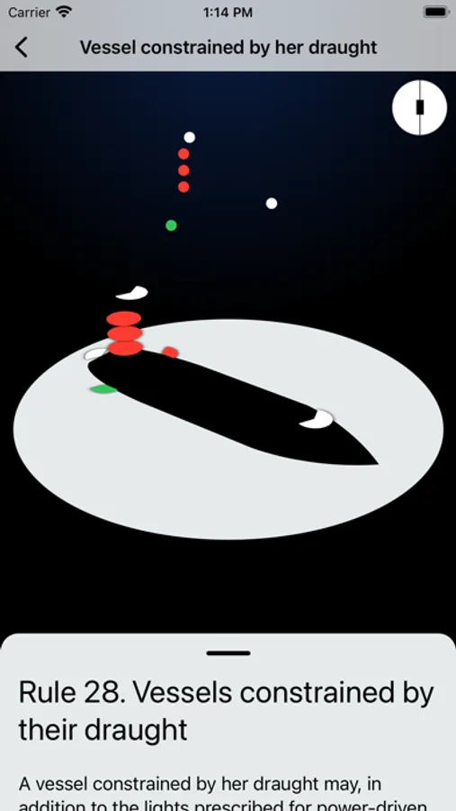 Application for studying night lights and daytime figures of vessels in accordance with the requirements of the COLREGs-72. The application allows you to observe the night lights of different types of vessels from different angles. Understanding of COLREG navigation lights allows you to correctly estimate vessel position, its maneuvering capabilities and to determine the nature of its work at night time and in poor visibility conditions.