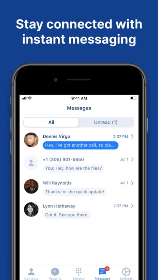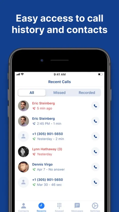 Have an actionable list of all your calls right at your fingertips. Immediately see the key details, such as who called whom, when it happened, and whether any voicemail messages were left. In a single tap, you can listen to any recorded call or return a call you missed.