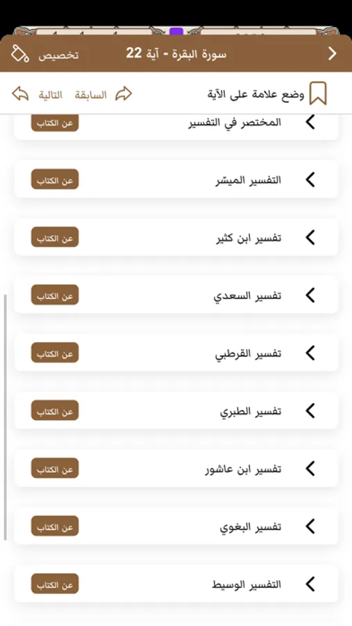 - امكانية ارسال نص الآية أو تفسيرها عبر وسائل التواصل