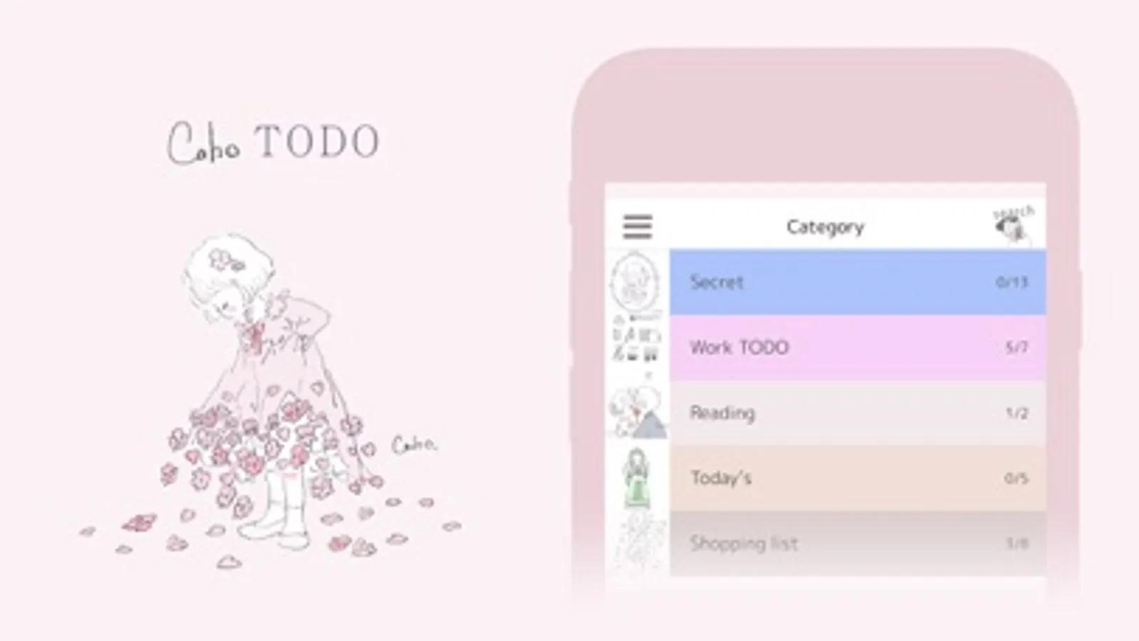 A cute illustration of a girl's life-sized feelings of love. The TODO application by Caho, an illustrator whose popularity is rapidly rising, is now available!
