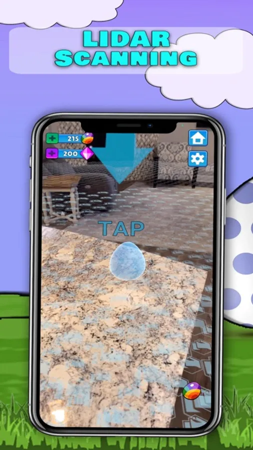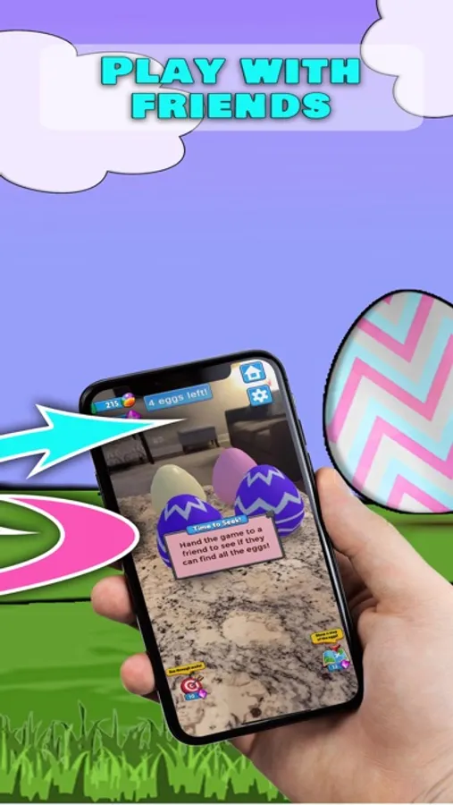 In 2 Player mode, hide virtual eggs for a friend to find or team up to find all the eggs together. Using AR, eggs can be anchored almost anywhere and even hide behind real objects.
