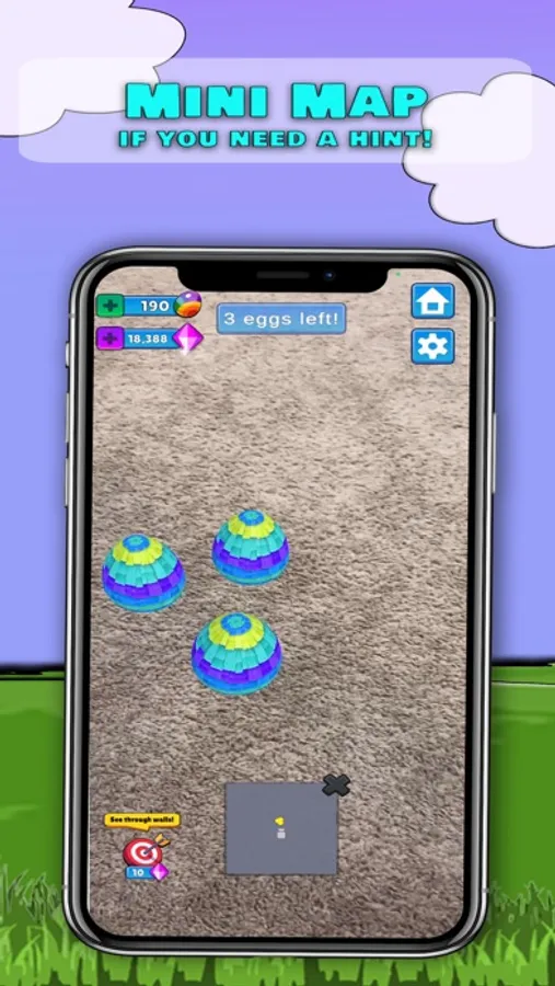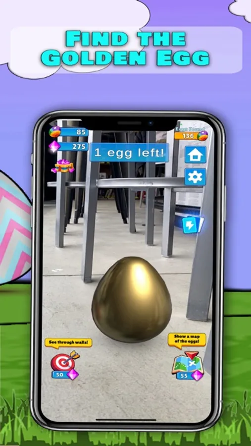 Find the special Golden Egg to win gems, which can then be redeemed for special in-game power-ups or custom eggs. The game uses your camera for AR, so make sure your camera lens is clean and allow access in your device settings. Play in a well-lit area for best results. If you need help finding eggs, use the X-Ray vision or Mini-Map power-up.