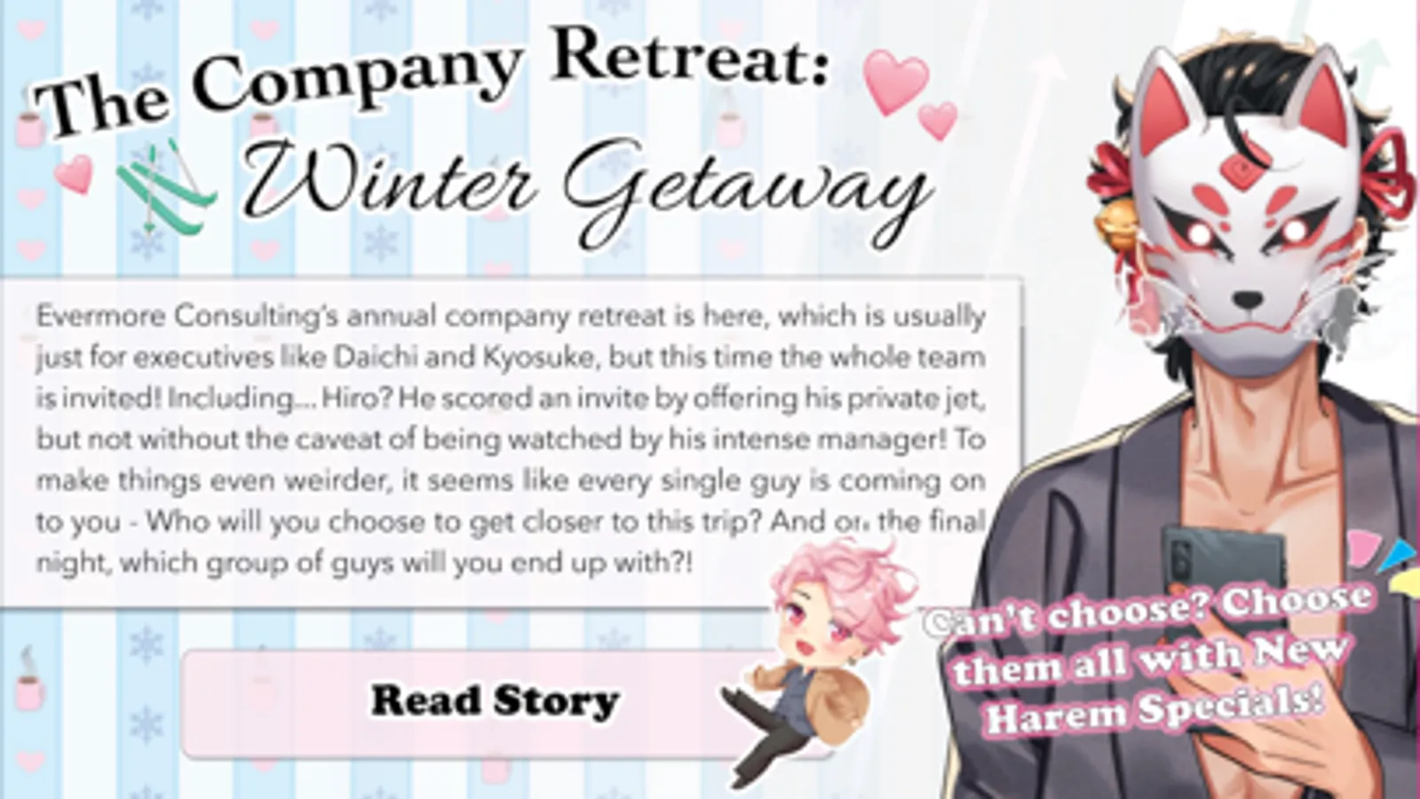 Kyosuke Aizawa: Meet the big exec, Kyosuke Aizawa! Kyosuke is confident, warm, and oh so hot! He’s the boss of the PR department you were working in, but you’ve been promoted to his executive assistance with perks like joining him as he works with big time clients! When he asks you to join him as a partner managing press for the Winter X Games, you think you may have finally broken down his professional boundaries.. however, there’s a good reason he keeps you at an arms length. Can you uncover what Kyosuke is dealing with behind the scenes?