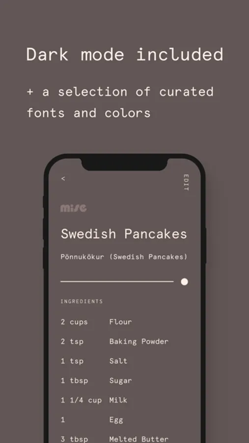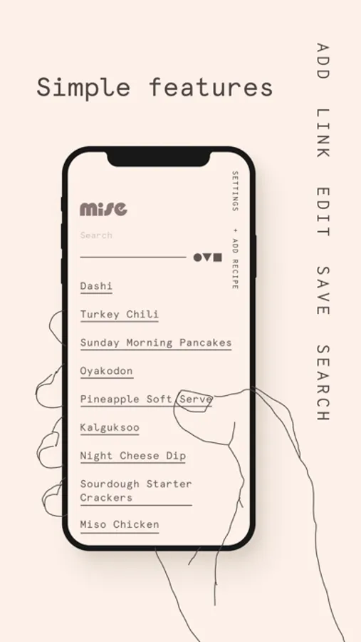 Mise is an easy to use, minimalist recipe box that displays recipes in a consistent and beautiful format. Its simple approach reduces the time you spend navigating recipes, so you can focus on mastering your dish.