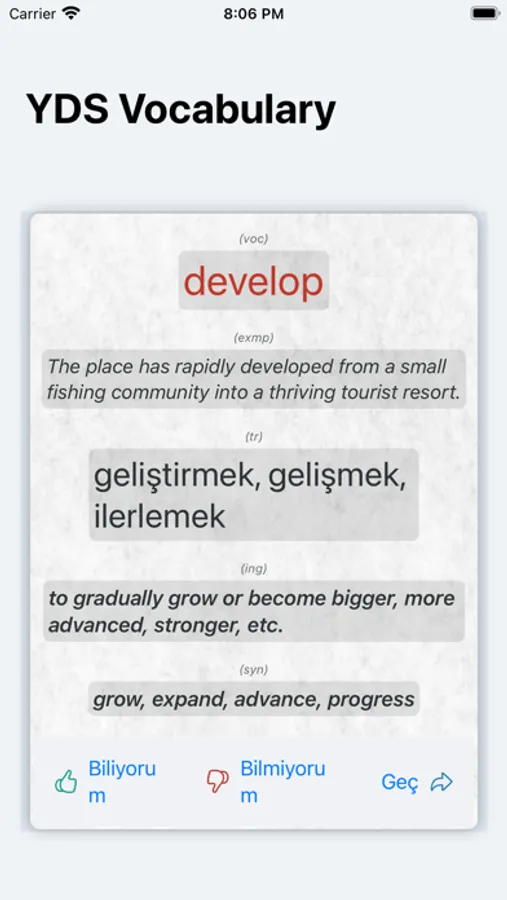 YDS sınavlarında çıkmış, çıkması muhtemel kelimeleri öğrenmeniz için mükemmel bir uygulama: Kelime kartları, çoktan seçmeli testler, eşleştirme ve cümle tamamlama testleri:
