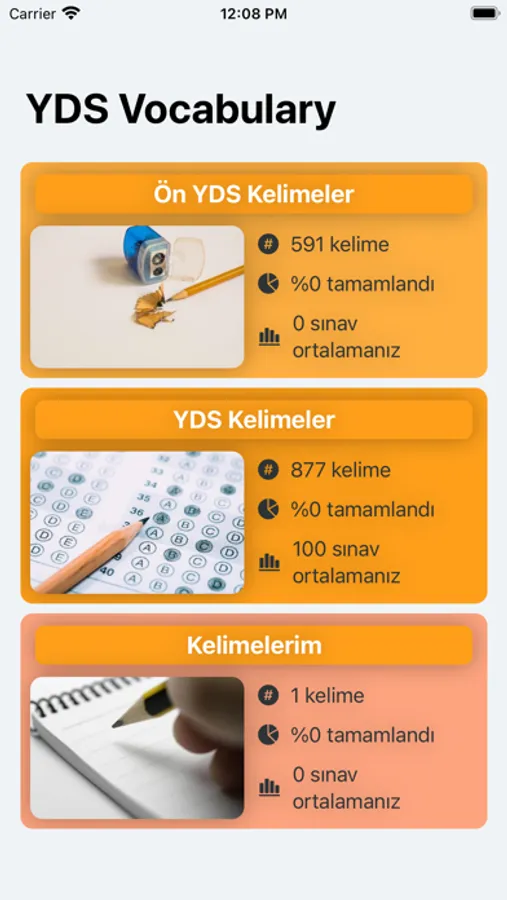 YDS Kelime Öğrenme uygulaması sayesinde öğrenmeniz kolaylaşacak. YDS veya Yökdil sınavlarında en çok karşılaştığımız kelimeler seviyelerine göre gruplandırıldı: Yds Ön hazırlık ve Yds hazırlık. Her bir İngilizce kelime grubu kelime kartları, çoktan seçmeli, eşleştirme testleri ve cümle tamamlama testleri ile kelime öğreniminizi kolaylaştıcak ve hızlandıracak şekilde hazırlandı.