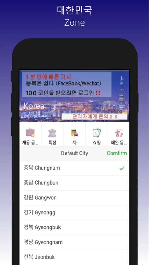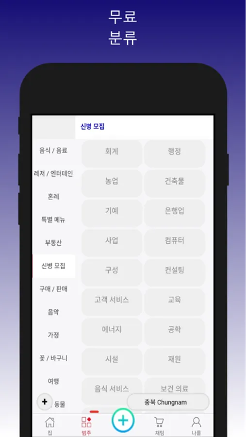 직업, 주택, 판매, 원하는 품목, 서비스, 지역 사회 서비스, 쇼, 이력서에 대한 섹션과 함께 한국 분류 응용 프로그램 ...