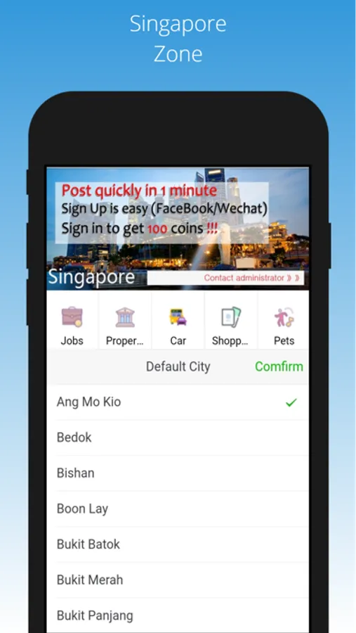 Singapore Classifieds App with sections about jobs, housing, sales, wanted items, services, community services, shows, resumes ...