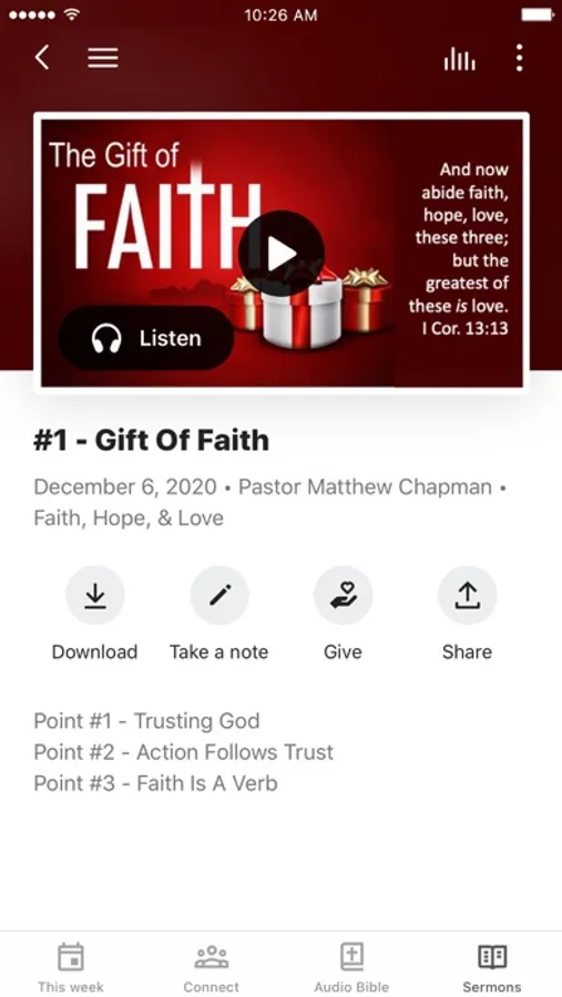 This app will help you stay connected with the day-to-day life of our church. With this app you can: watch or listen to past messages; stay up to date with push notifications; share your favorite messages via Facebook, YouTube or email; and download messages for offline listening.