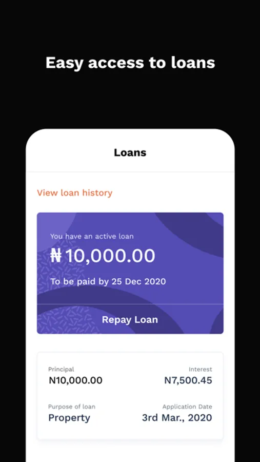 To access our loans, you must be at least 21 years of age. We may require that you provide a valid Government ID. You can get as little as N5,000 and up to N50,000 and you can pay back between 60 to 180 days. Our usual repayment period is monthly. Our minimum interest rate, which is determined by our credit scoring algorithm, is 3% per month and a maximum of 10% per month. This comes to an Annual Percentage Rate (APR) of 36% to 120%.
