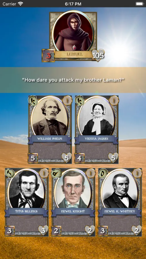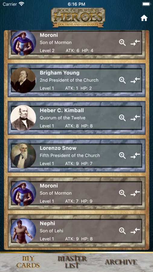 This app brings the characters of the Book of Mormon and Doctrine and Covenants to life in a way you have never experienced before. Each card shows a picture of the character, gives details about their life, and lists the scriptures where they can be found. If you get more than one of a card, then trade it with a friend! Once your collection is at legendary level, you can journey on a campaign to take on the villains of the Book of Mormon yourself! In this expansion, you will also encounter common enemies that the early church members had to face!