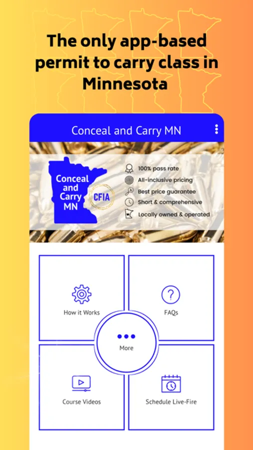 Conceal and Carry MN is an all-in-one FREE app that allows customers to complete the required training and schedule their in-person live-fire exercise. You only pay if you schedule a live-fire exercise. Upon successful completion of the training course and live-fire exercise, students receive a certificate of completion. Students may then apply for a Minnesota Permit to Carry.